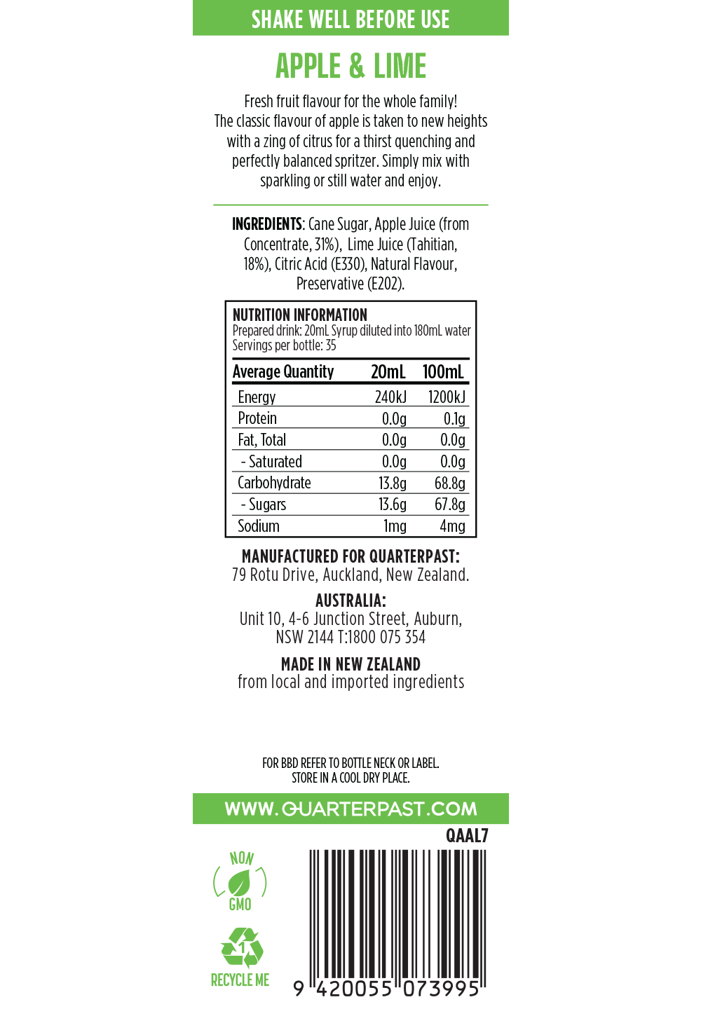 Recommended use: Add 20mL of syrup to still or sparkling water.