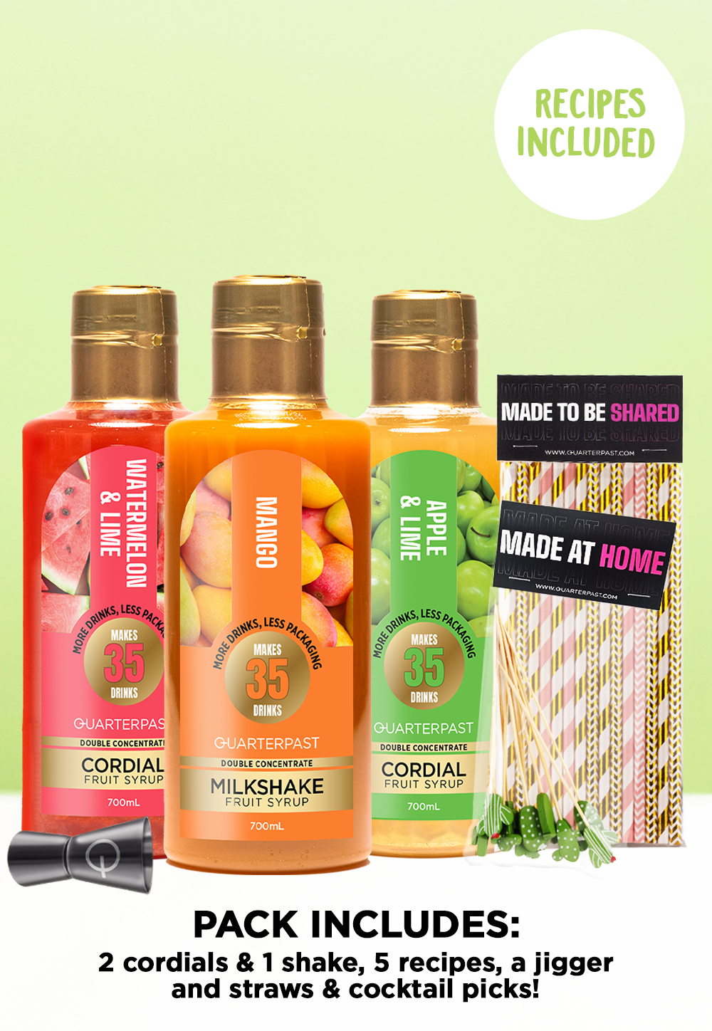 Host like a pro (and sip like one too) with this Real Fruit Margarita Kit! Featuring Watermelon Lime, Apple & Lime, and Mango, plus a jigger, cocktail picks, straws, and recipes, it is your shortcut to bar-worthy drinks at home. Just add your liquor, shake, and share the good times, because every great night starts with a marg.